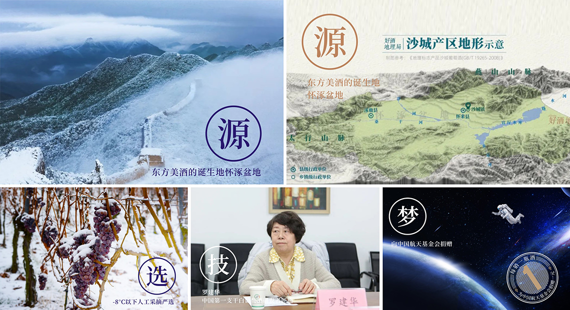 自己: 源 ▶ ”东方美酒”的诞生地怀涿盆地    选 ▶ -8°C以下人工采摘严选    技 ▶ 大师罗建华(中国第一支干白葡萄酒研发者)匠造    梦 ▶ 助力航天